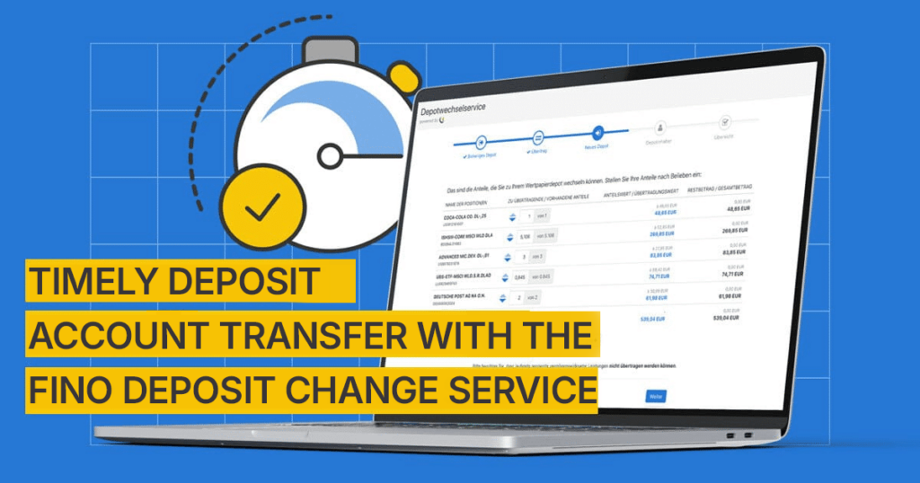 Deposit change service Deposit transfer in record time Guaranteed timely deposit transfer from fino.digital – simplify the change of securities account for your customers and increase customer satisfaction! Act now New deadline for securities account transfer How long can a securities account transfer take? The German Federal Financial Supervisory Authority (BaFin) has imposed a new […]