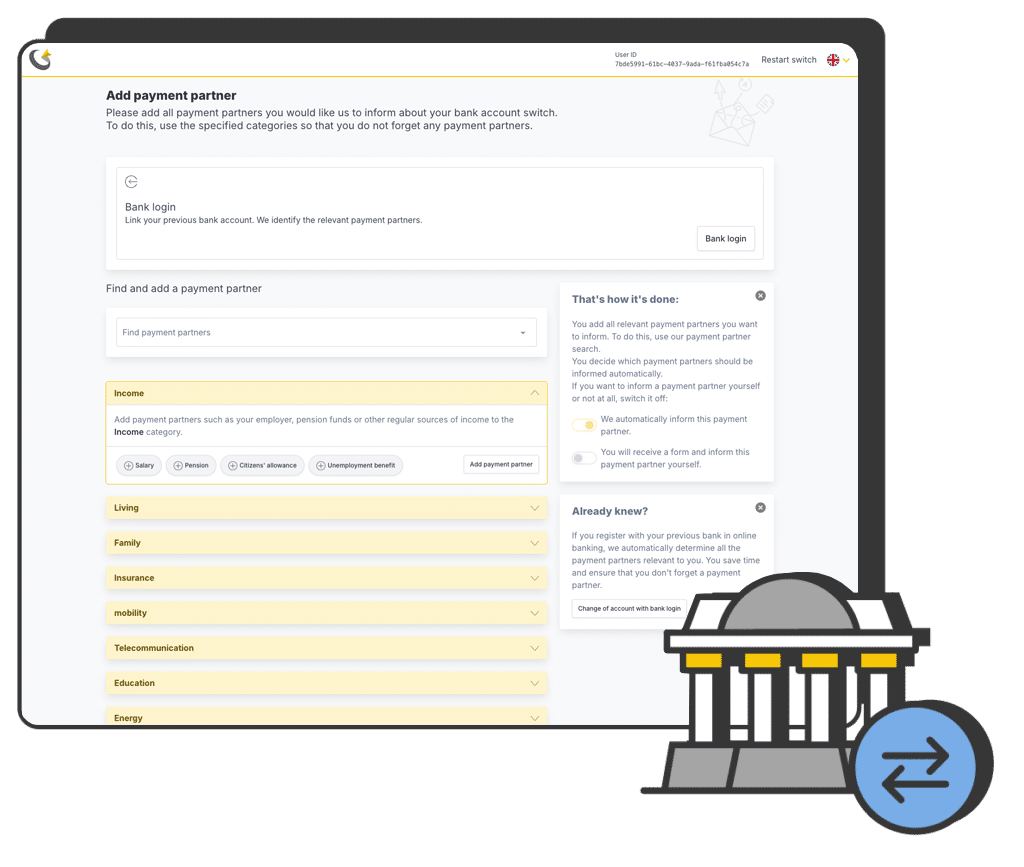 When a bank-internal inheritance case is processed, the heir receives a new IBAN and you as the bank are required to inform the payment partners of this. Simply leave this to us and save 95% of the back office work.